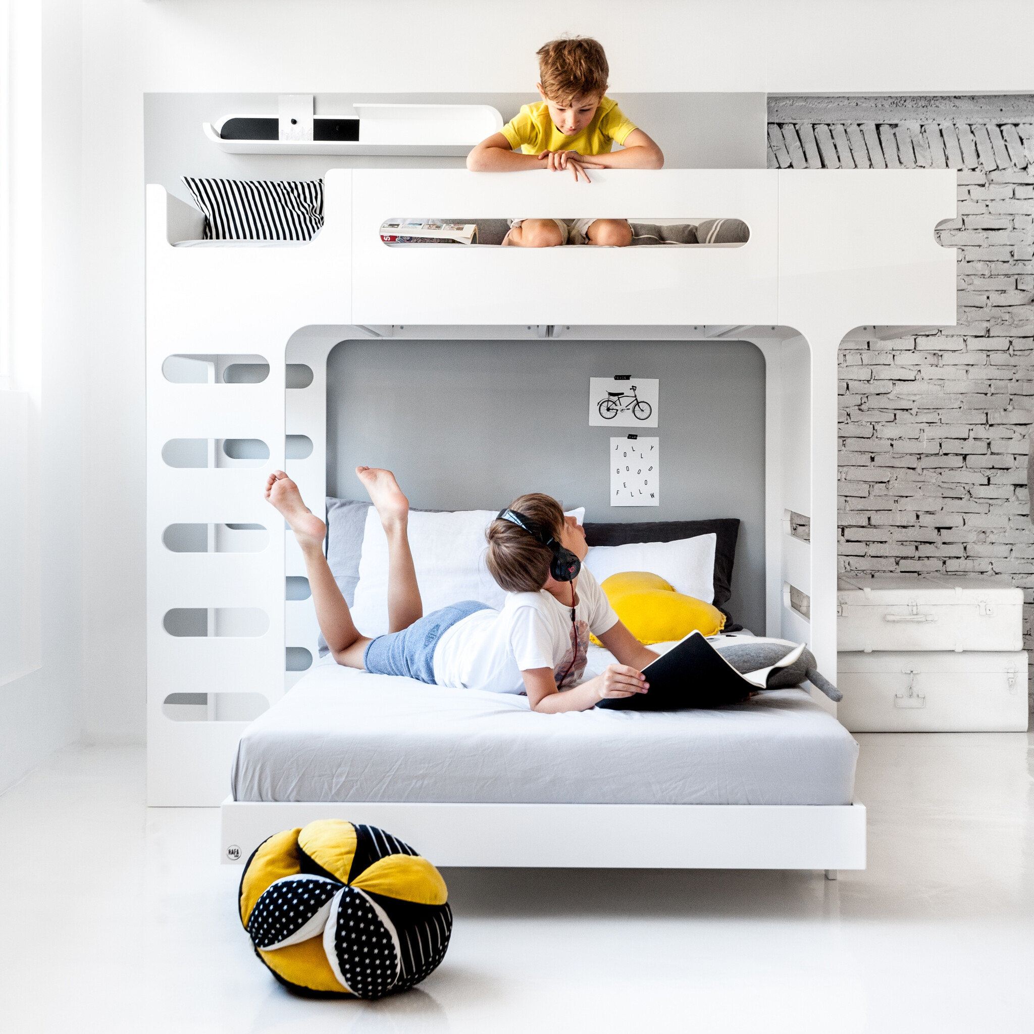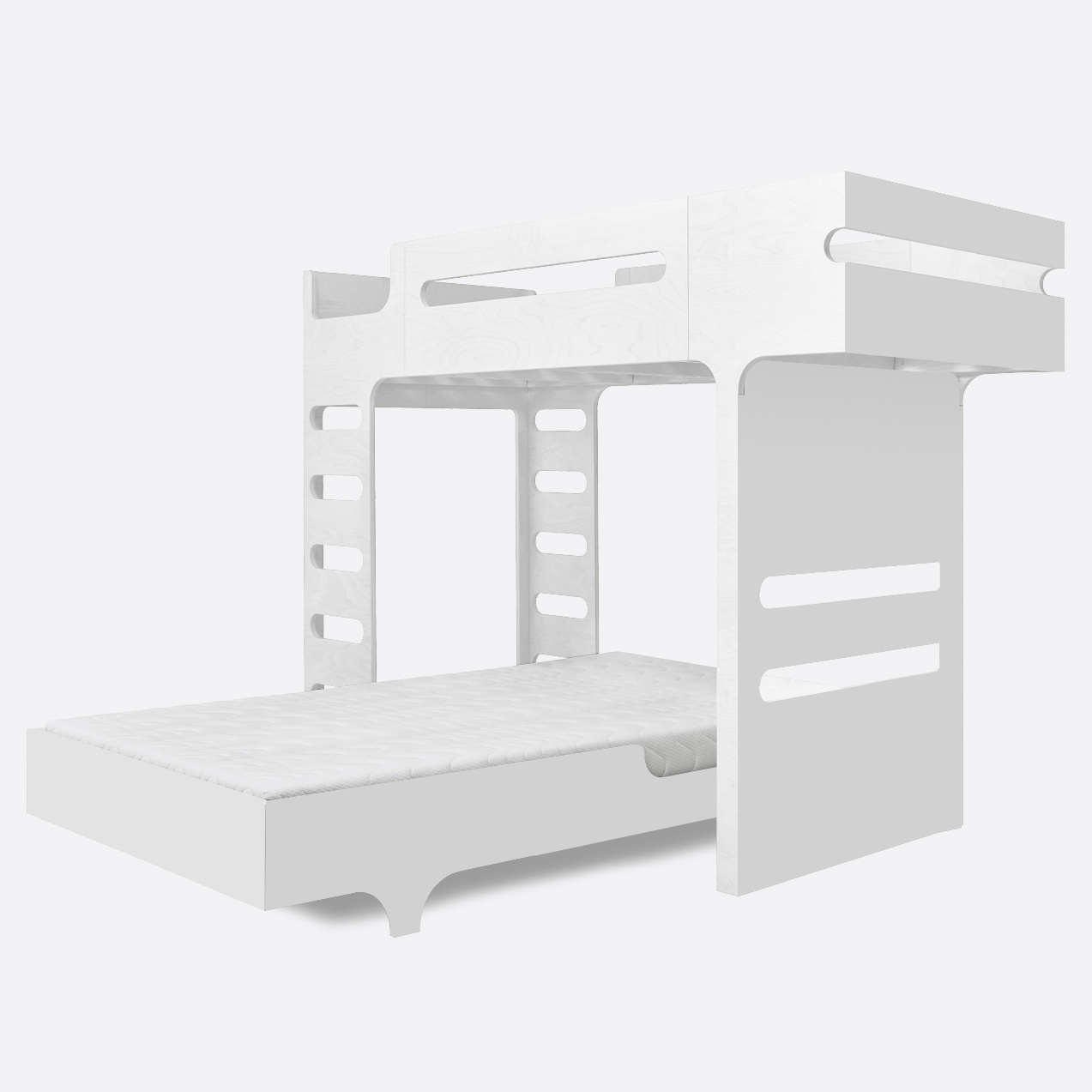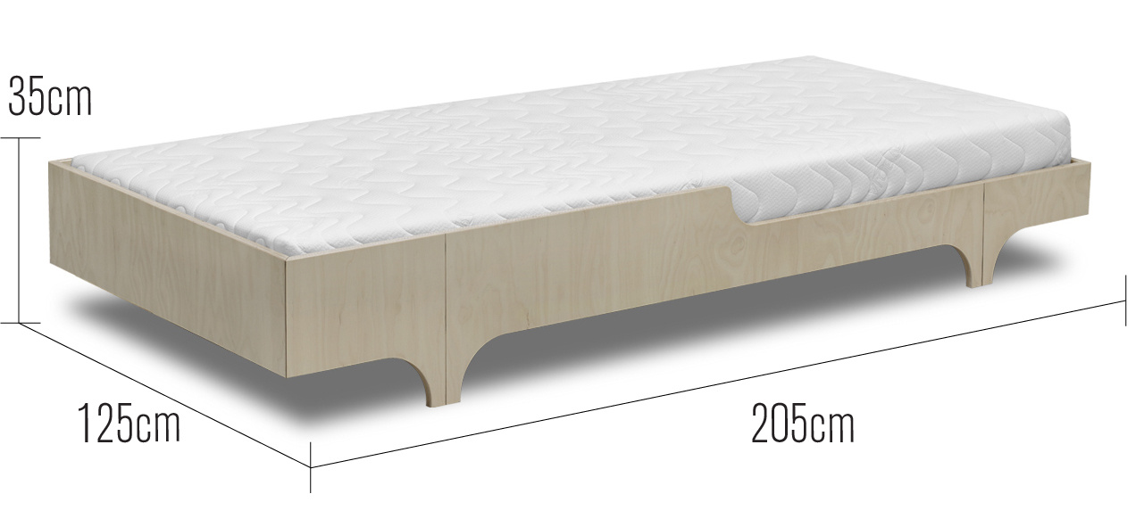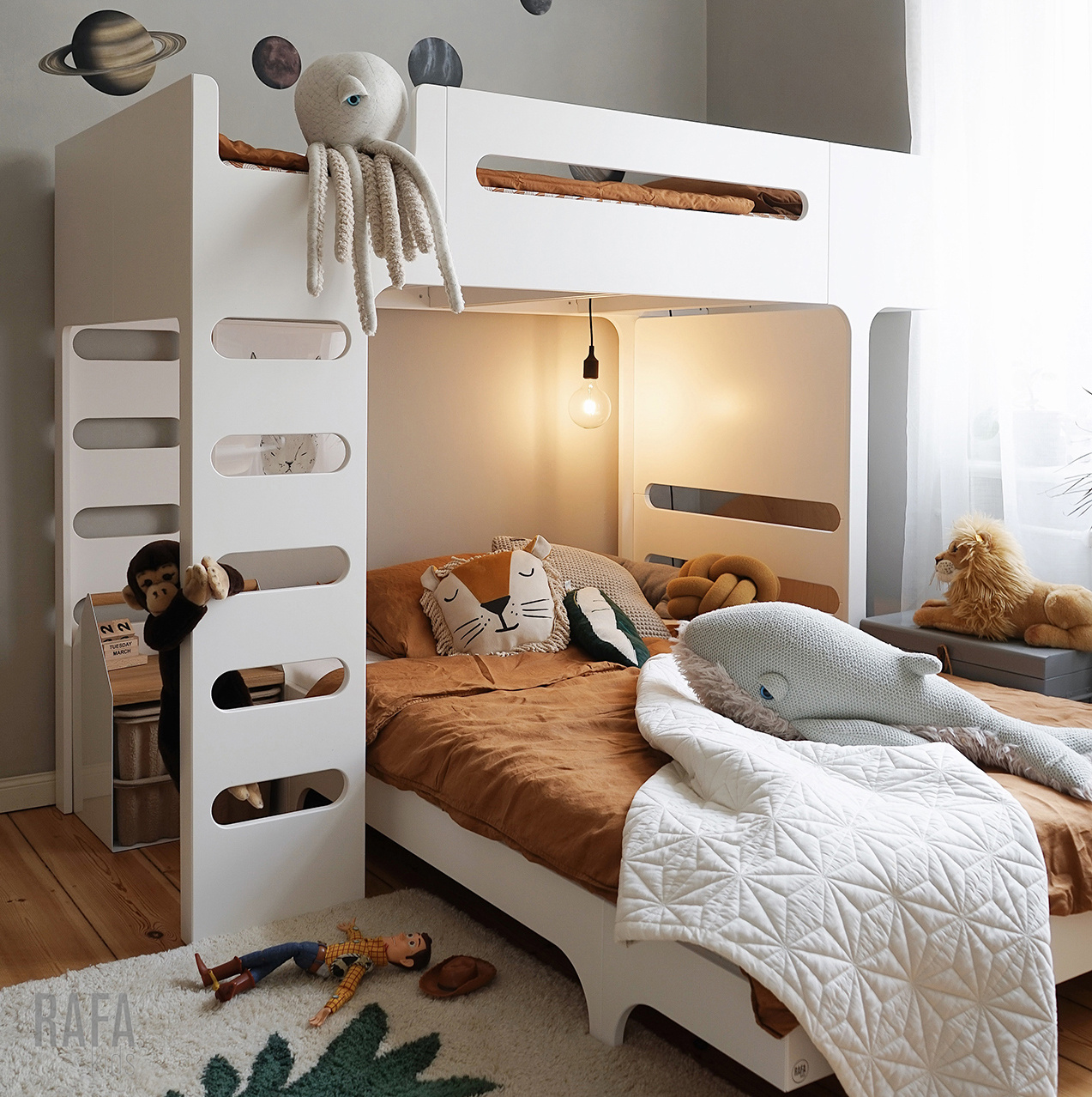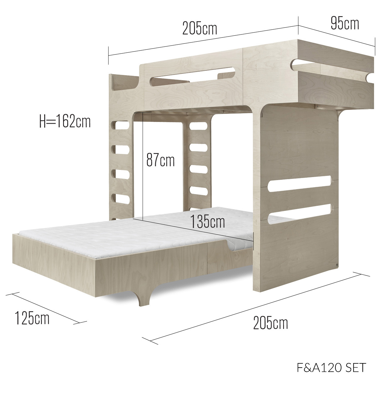Das A75 Bett (Matrazenmaß 75 cm) ist schmal und passt perfekt under das Etagenbett F.