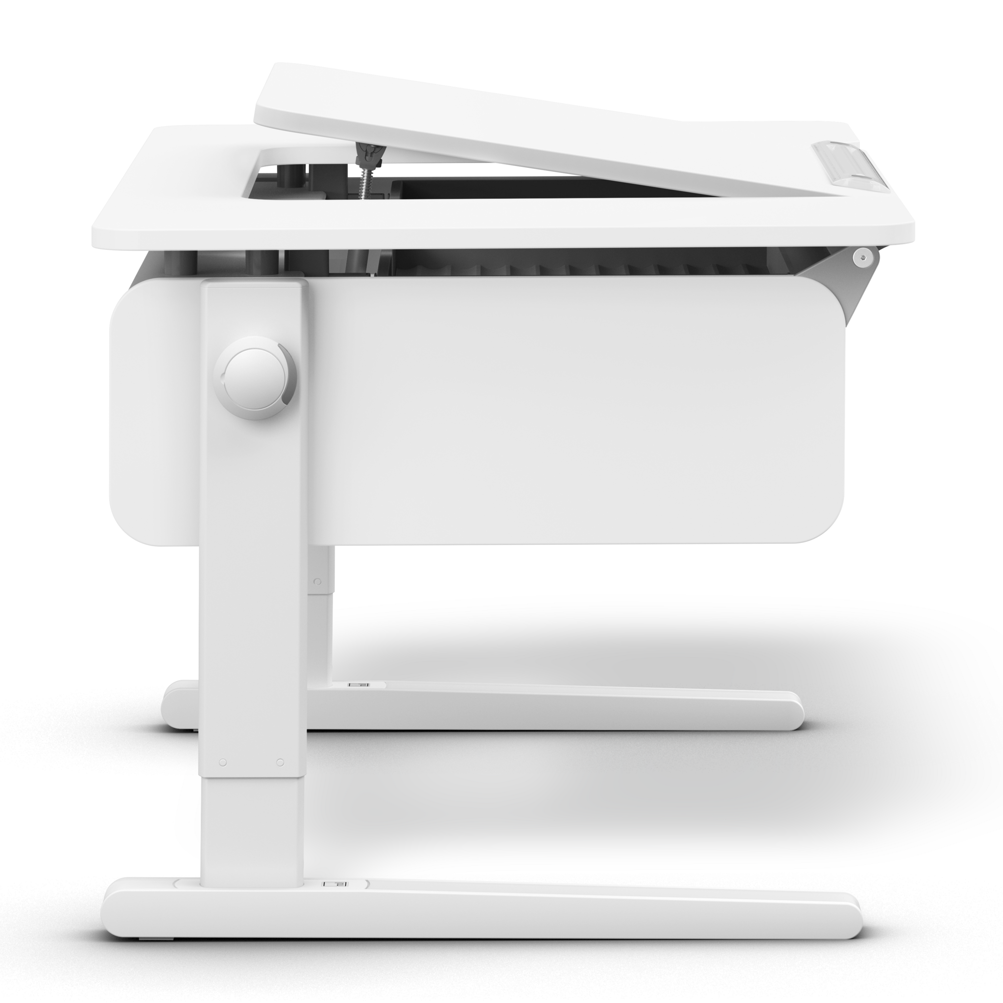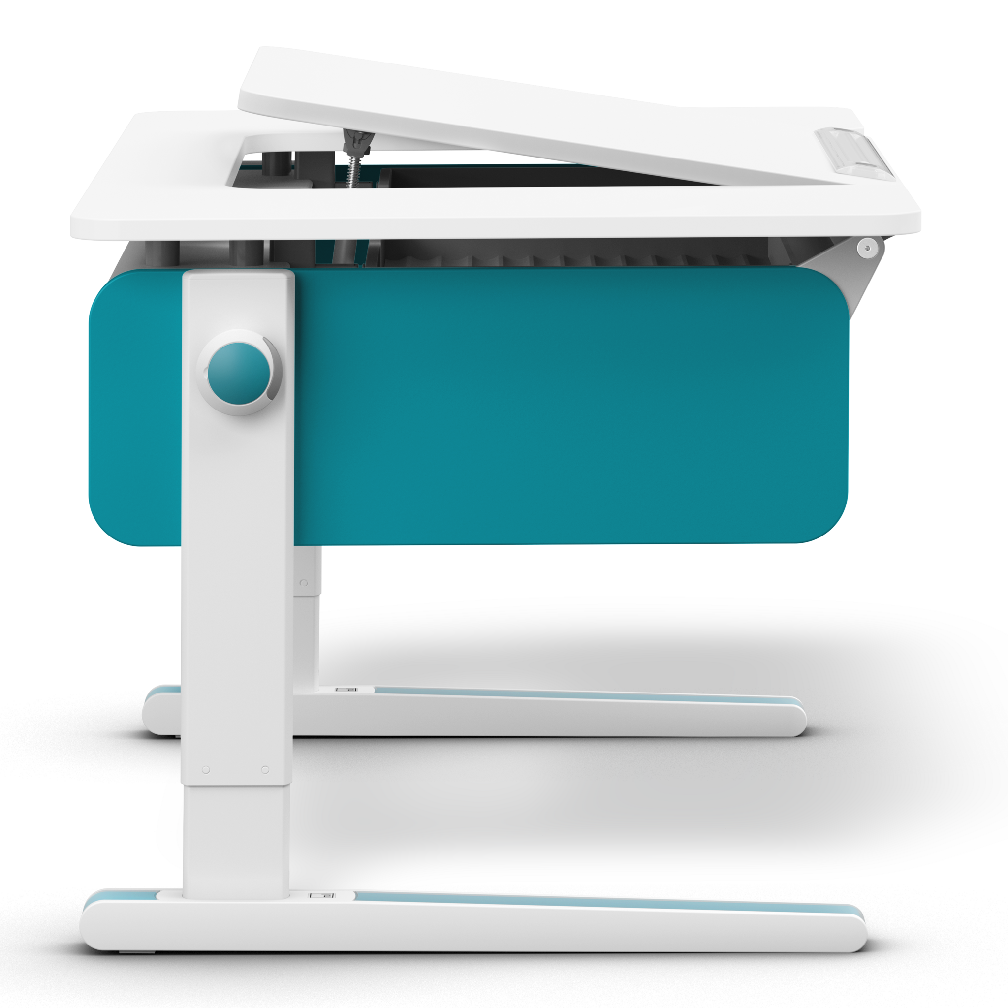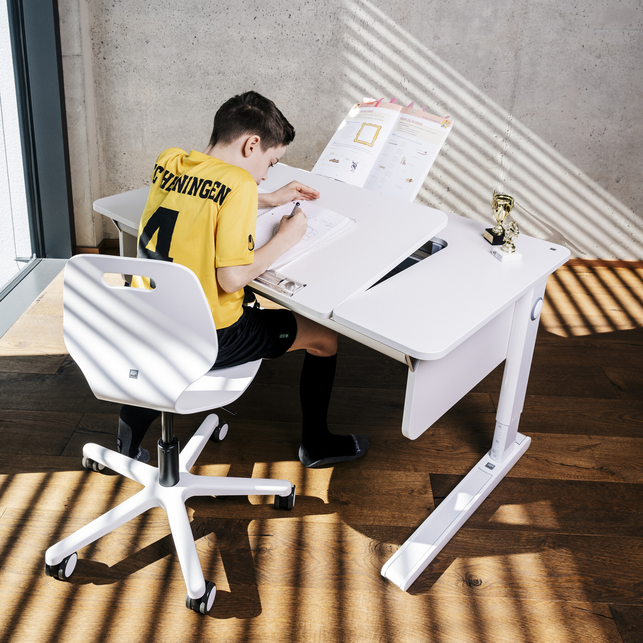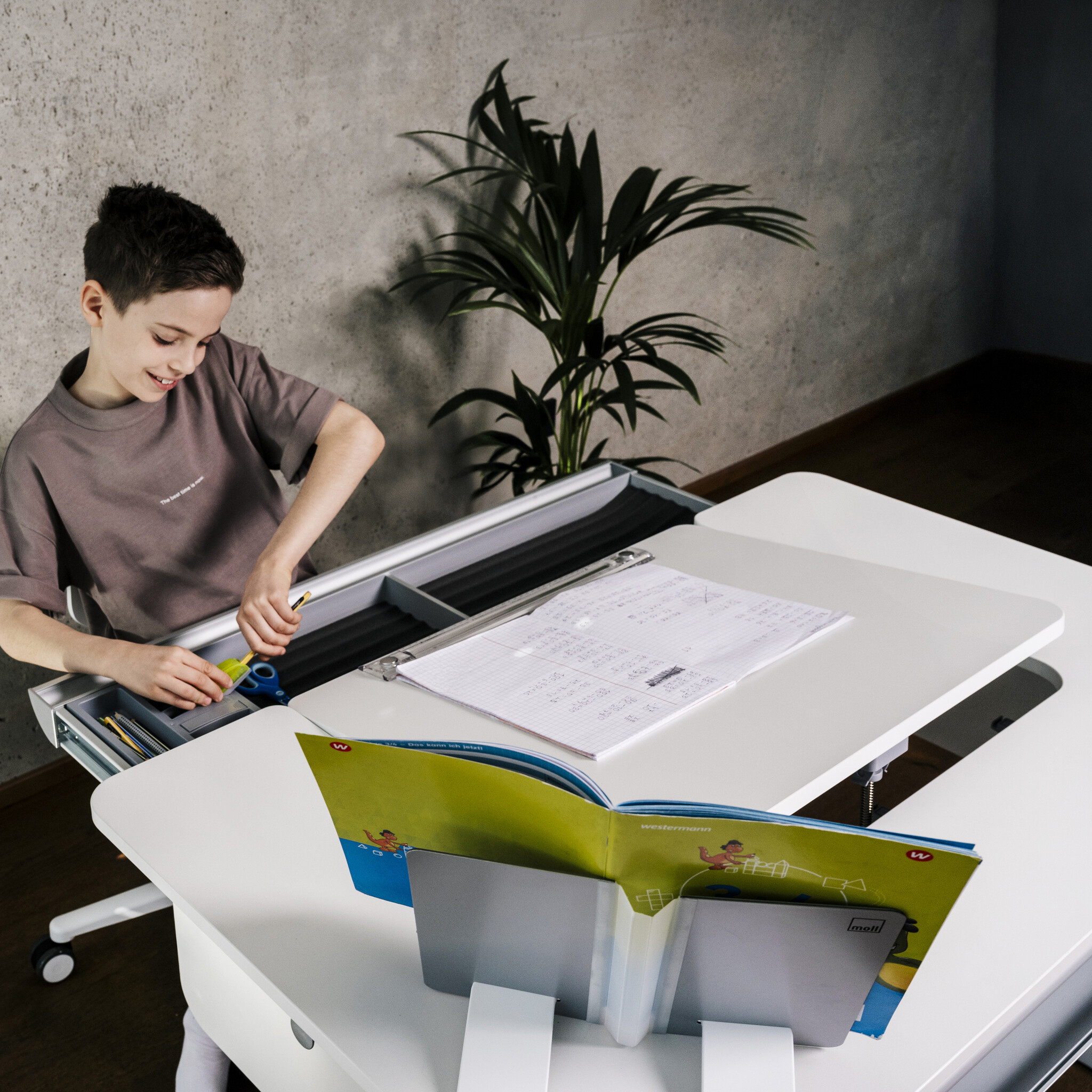Der Kinderschreibtisch Champion Center Up von Moll. Schrägstellung und Höhenverstellung gelingen mit einzigartigen Mechaniken kinderleicht. Die Farbe der Seitenblenden kann ausgewählt werden. Lesen Sie mehr