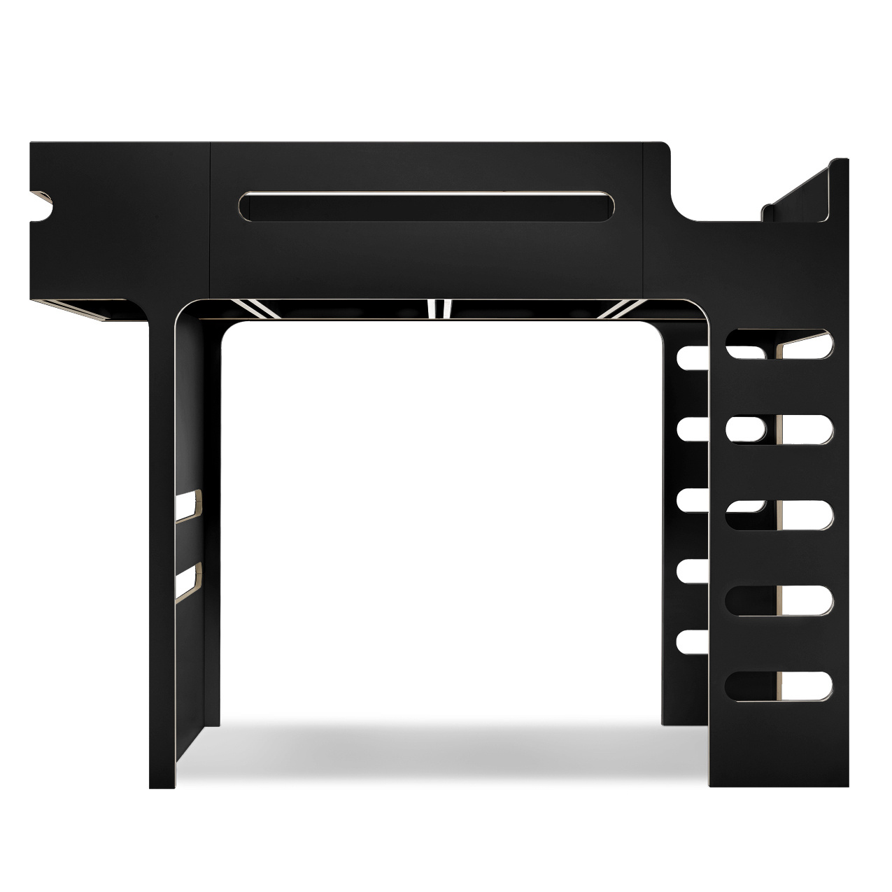 Das F Hochbett hat auf beiden Seiten jeweils eine Leiter und kann so sehr flexibel im Raum platziert werden. Anstatt eines Lattenrostes wird hier ein fester Boden mit runden Löchern verwendet. Dies garantiert eine zusätzliche Stabilität. Die Löcher sorgen für eine gute Belüftung und sehen von unten lustig aus.