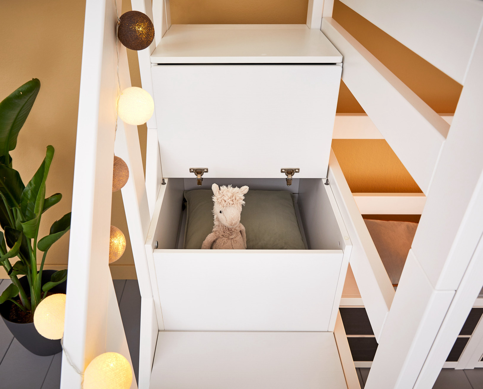 Das Hochbett mit Treppe 120x200 ist Teil des neuen 120x200 Systems von Lifetime. Es eignet sich für alle, die sich ein Hochbett mit extra Beinfreiheit und viel Stauraum wünschen. Besonders hervorzuheben ist, dass sich das Bett durch das Treppenmodul als wahres Platzwunder erweist. Die Treppe kann rechts oder links montiert werden. Für den Einstieg wird ein halb-offenes Kopfstück mitgeliefert.