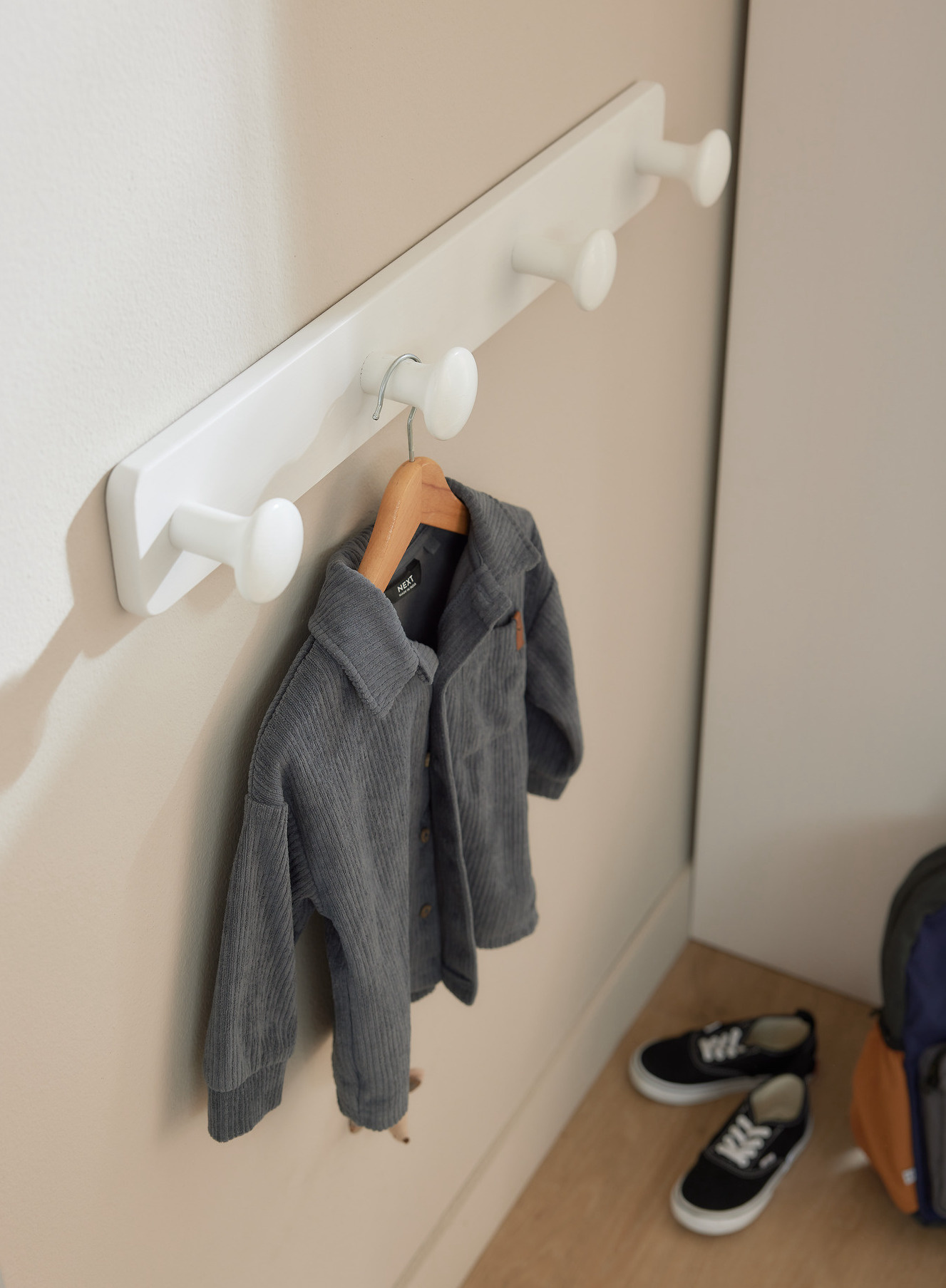 Die Kleiderhakenleiste wird einfach an eine Kopfseite des Bettes eingehängt. Oder die Leiste wird an der Wand montiert. Lesen Sie mehr