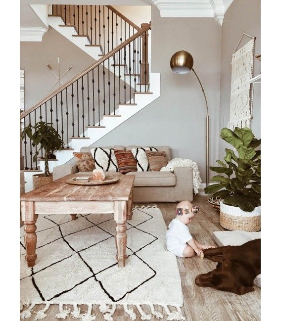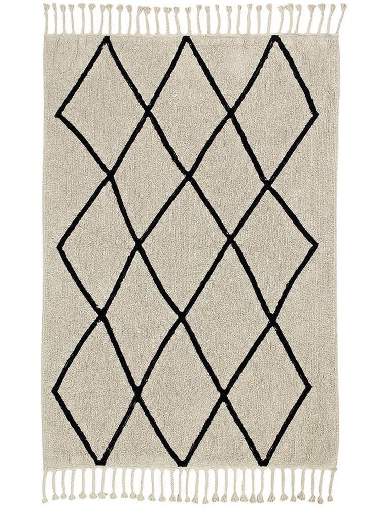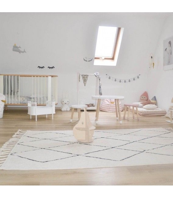 Eleganz und Komfort für die angesagtesten Ecken Ihres Zuhauses dank dieses Berber-Stücks aus der Black & White-Kollektion. Maschinenwaschbar, aus 100% Baumwolle (herkömmliche Waschmaschine mit einer Kapazität von 9 kg für 140 x 200 cm). Perfekt für das Kinderzimmer aber auch ein Hingucker in Wohn-, Ess- oder Schlafzimmern. Die schwarzen feinen Linien erzeugen Diamantformen auf farbigem Hintergrund und verleihen diesem Teppich eine zeitlose Eleganz. Handgemacht, unter Verwendung natürlicher Farbstoffe und leicht, weich und flexibel, da er nur aus Baumwolle hergestellt wird.