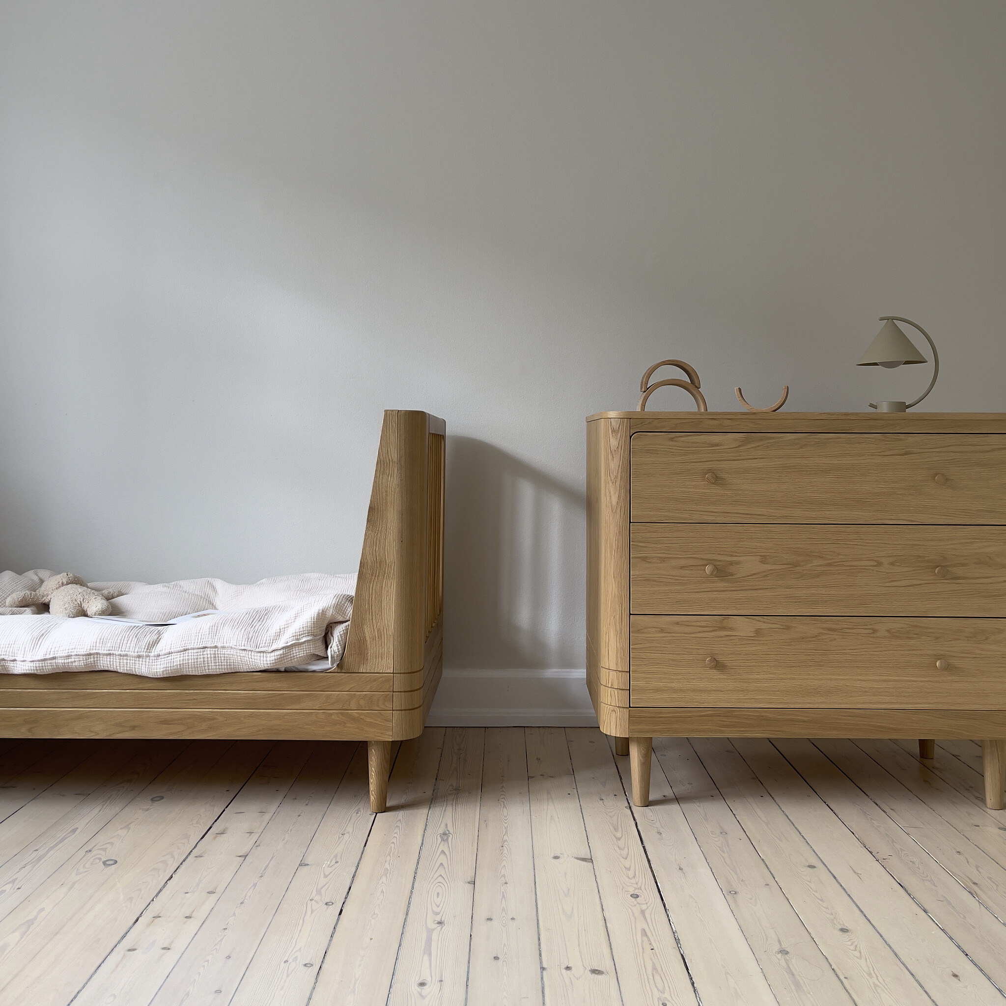Das schlichte Design mit abgerundeten Details und das massive Eichenholz verleihen dem Bett eine warme Ausstrahlung.