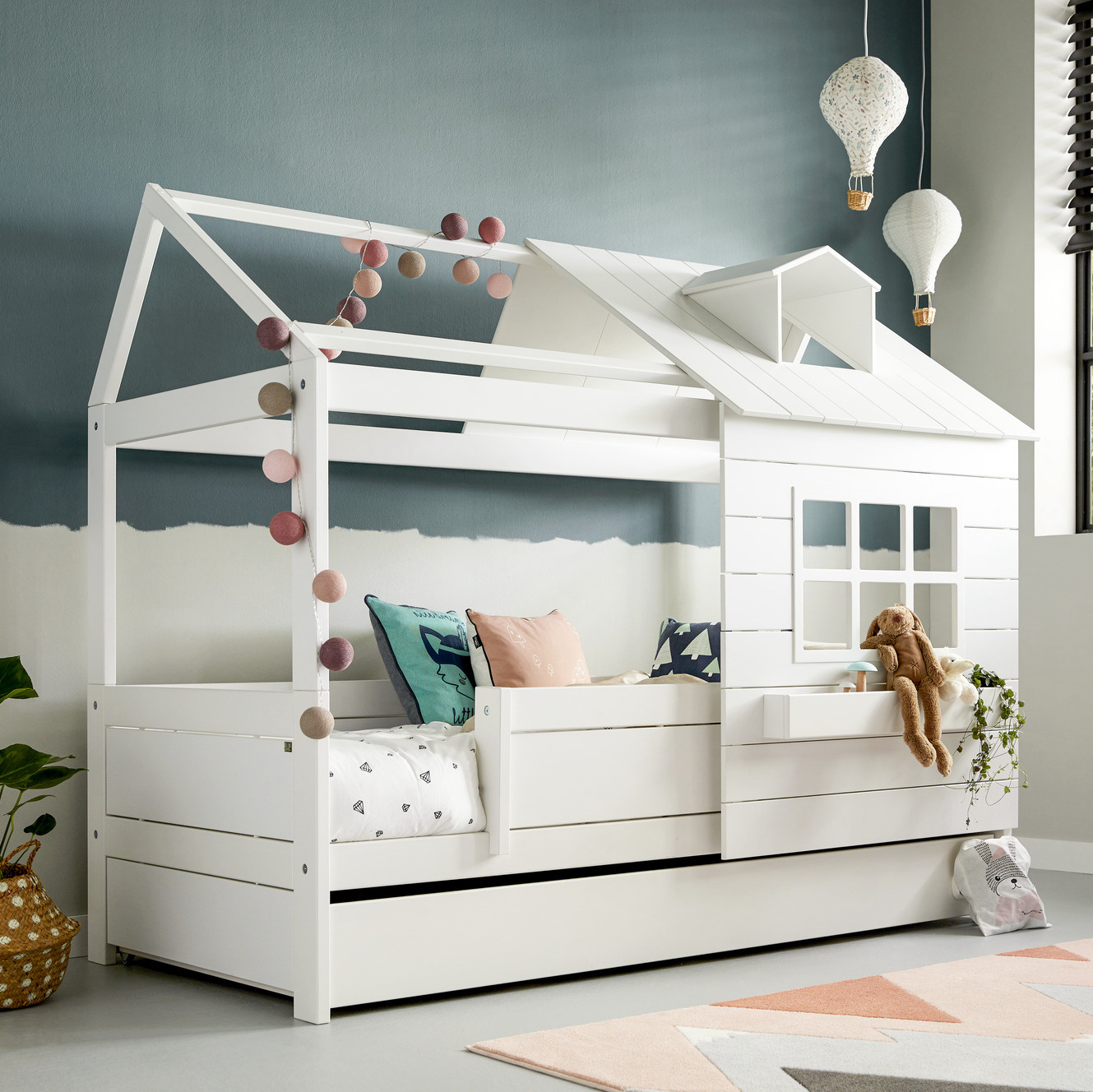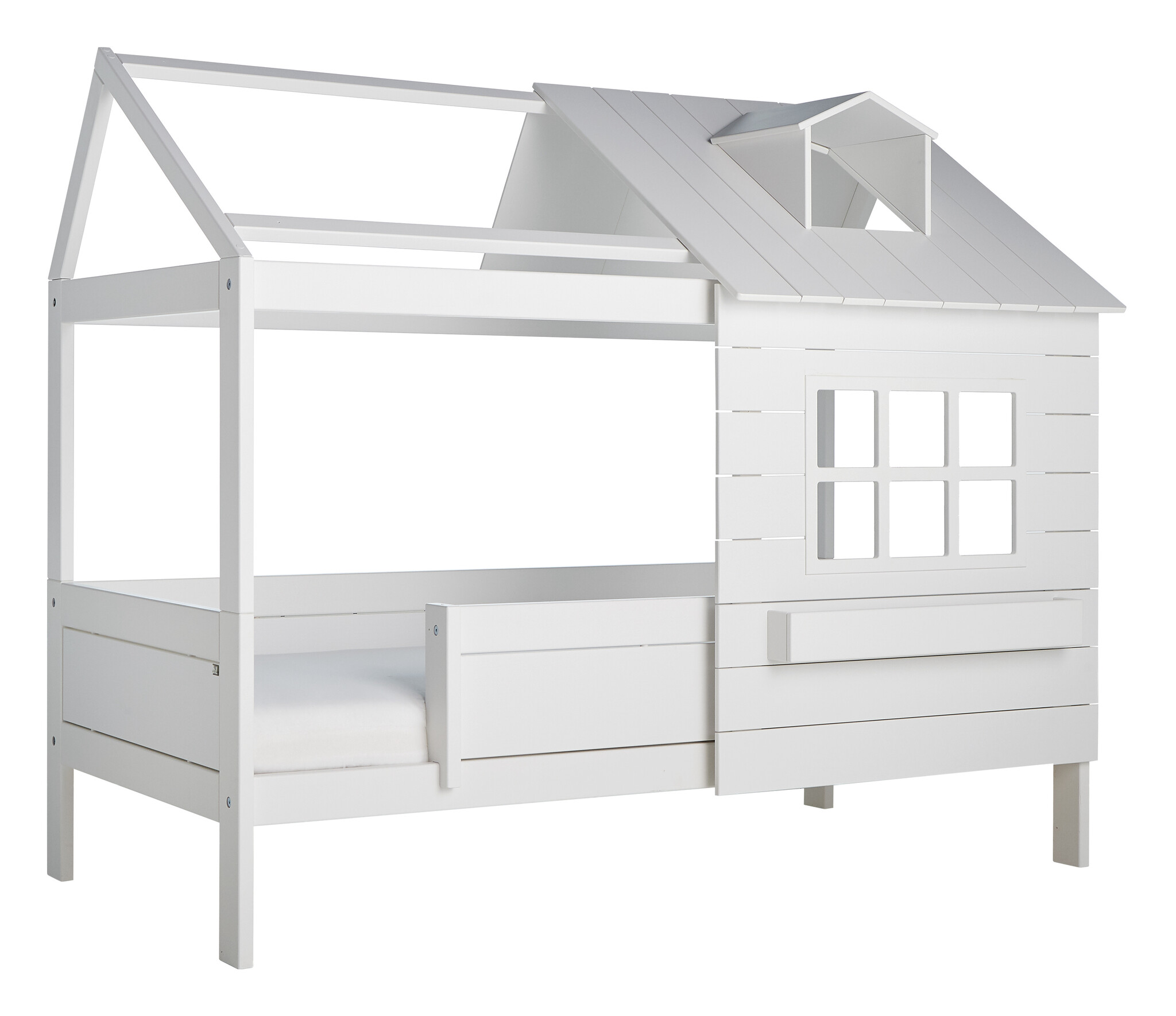 The cottage bed "Lake House 1" from Lifetime consists of the basic bed with semi-enclosed cottage bed construction. It enhances any children's room and is adaptable to the development of their child through additional extensions. It is especially suitable for younger children due to its construction, as there is no danger of falling out. With an additional bed drawer, the space under the bed can be wonderfully used as storage space.