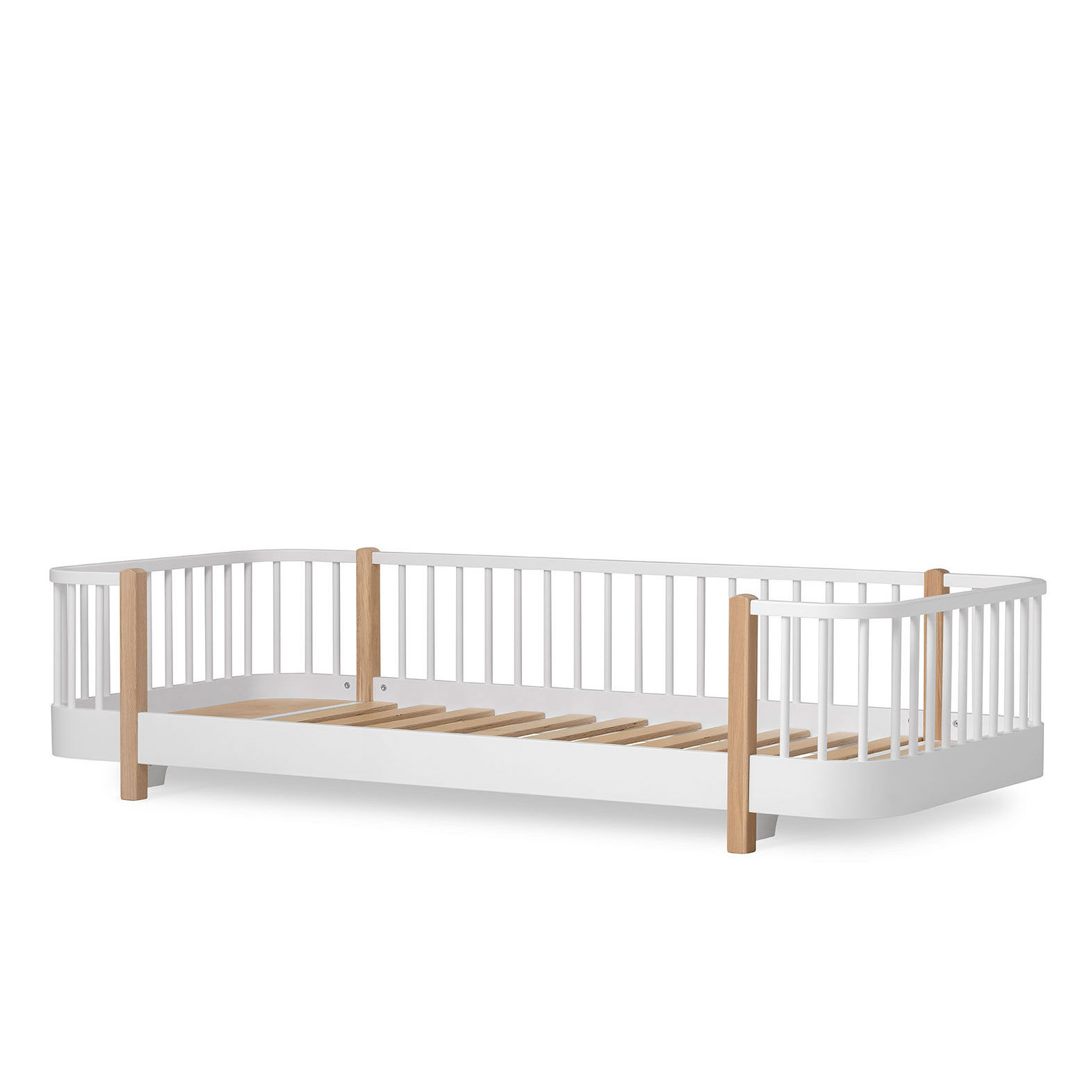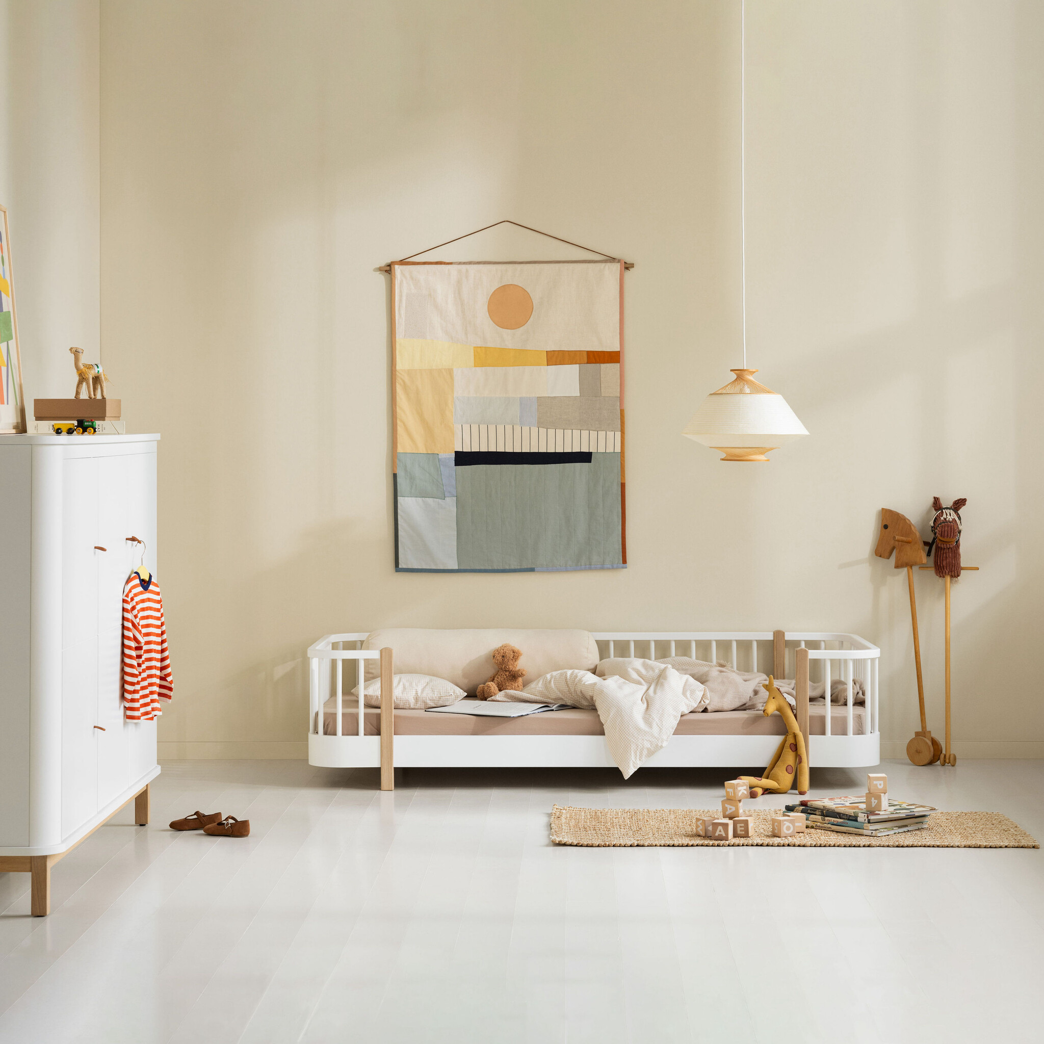 The beds of the Wood Original Collection series are made of solid birch wood. They are available in all white or with vertical supports made of Nordic oak. The day bed is a classic, stylish bed. Timeless and durable. With a continuous backrest. It is ideal as a guest bed, as well as a teen bed, as it functions as a beautiful sofa during the day and can be used as a bed for the night.